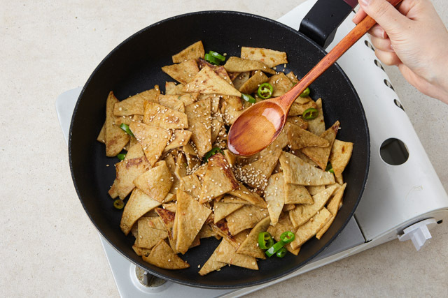청양고추를 넣어 어묵에 고추향이 배도록 볶는다.