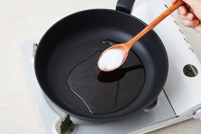 양조간장 1T, 물, 설탕을 후라이팬에 먼저 넣고 달궈 설탕을 녹인다.